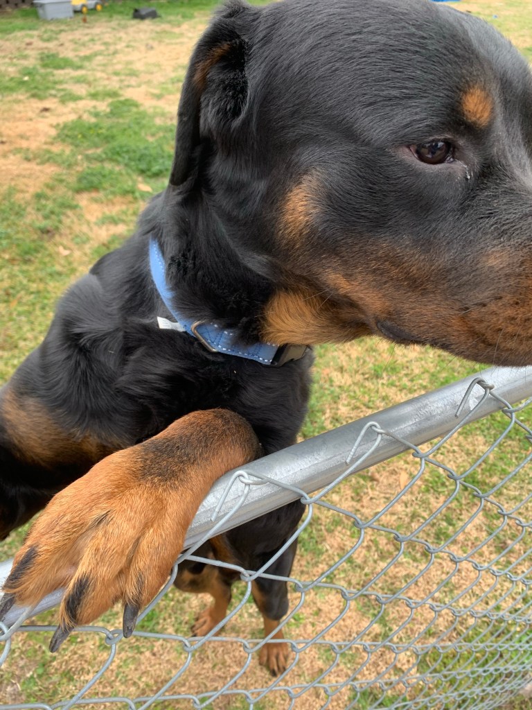 Say hello to King! He is a Rottweiler pup of almost a year and I will spoil him every time I see him in his back yard.
