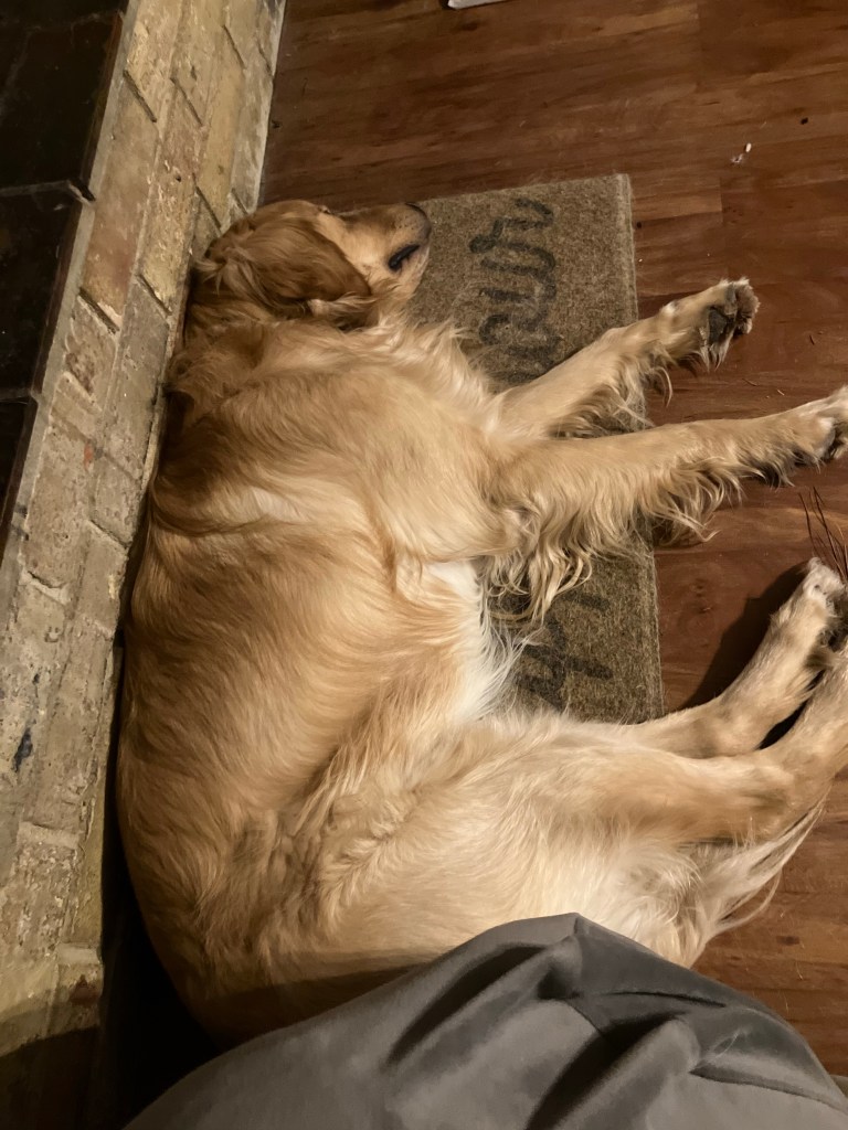 Someone’s enjoying the fireplace being used, but I’m going to have to set up a guard rail before he learns what happens when a spark somehow gets through the doors and lands on fur.